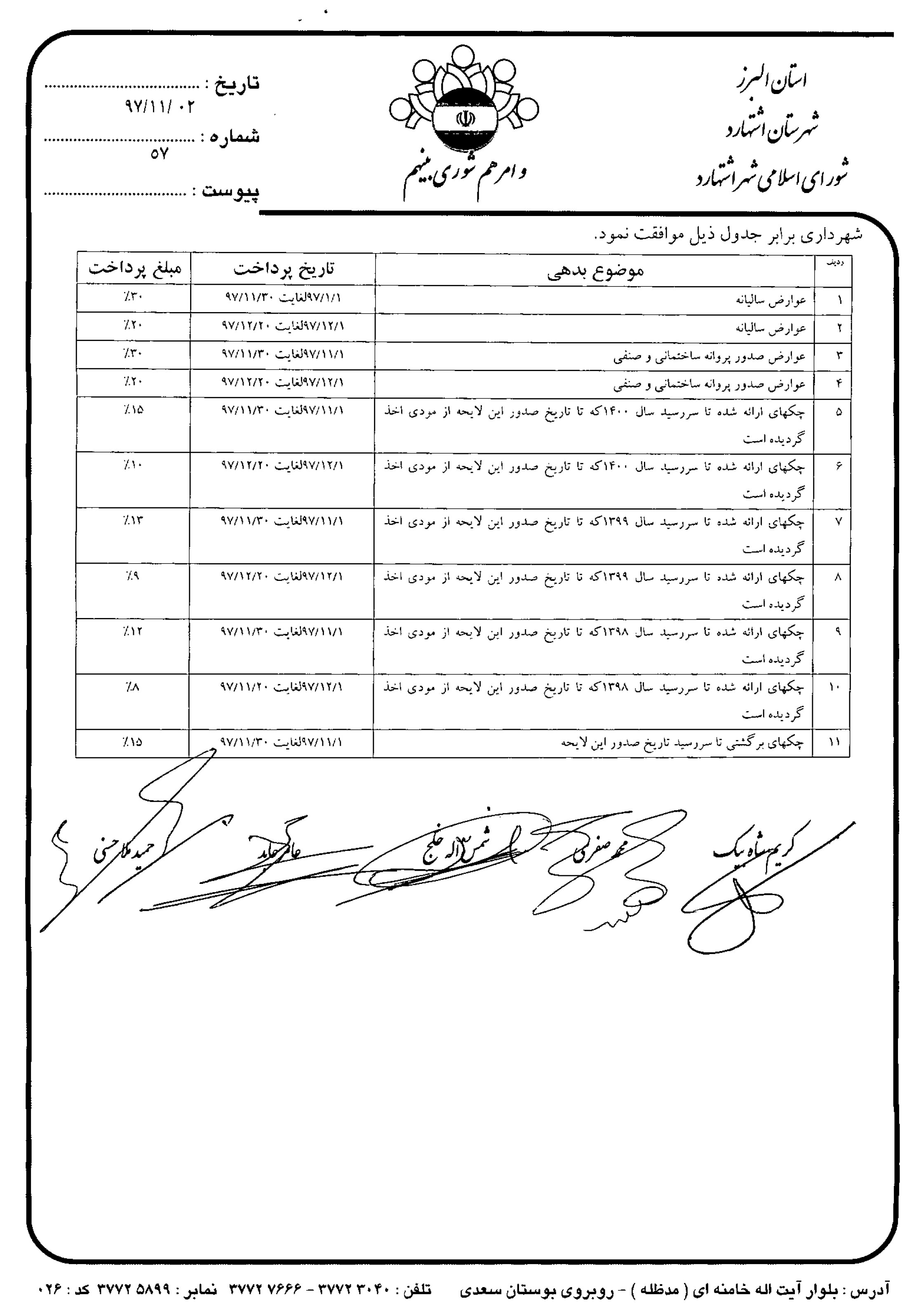 به اطلاع می رساند به مناسبت چهلمین سالگرد پیروزی شکوهمند انقلاب اسلامی ایران و در راستای اجرای مصوبه شماره 57 مورخ 2/11/97 شورای محترم اسلامی شهر اشتهارد به منظور ارائه خدمات بهینه به شهروندان عزیز، مودیان محترم شهرداری اشتهارد می توانند در صورت تسویه حساب نقدی از تخفیفات ویژه شهرداری طبق مصوبه مذکور بهره مند گردند.